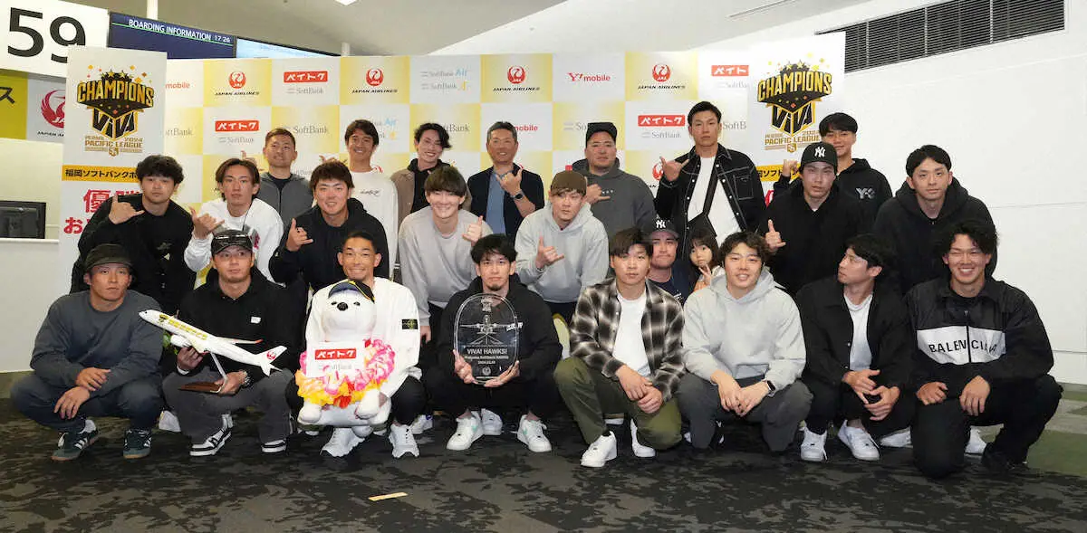福岡国際空港から同日夕に日本航空のチャーター便で離日。V旅行には小久保裕紀監督(53)や選手26人、球団スタッフ、その家族らが参加し、約1週間、常夏の楽園で英気を養う。「家族の方を喜ばせるように。もてなしてあげてほしい」と小久保監督は機内に乗り込む選手、家族を見ながら話した。離日前には優勝記念チャーター出発式が行われ、セレモニー後に続々と搭乗していった。小久保監督は「それでは」と話し、機上の人となった。