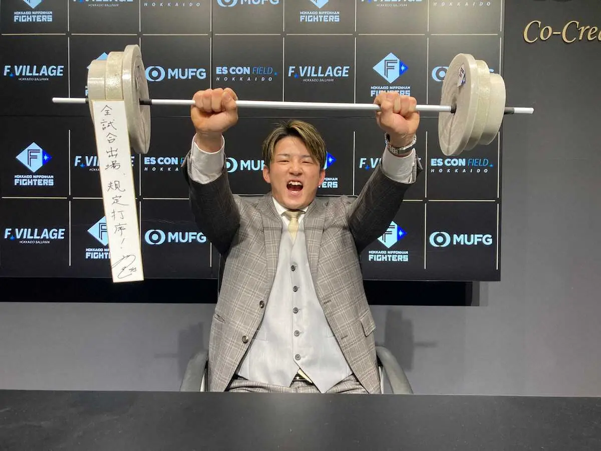 契約更改交渉を終え、マックス140キロを誇るベンチプレスのポーズをとる日本ハム・水野