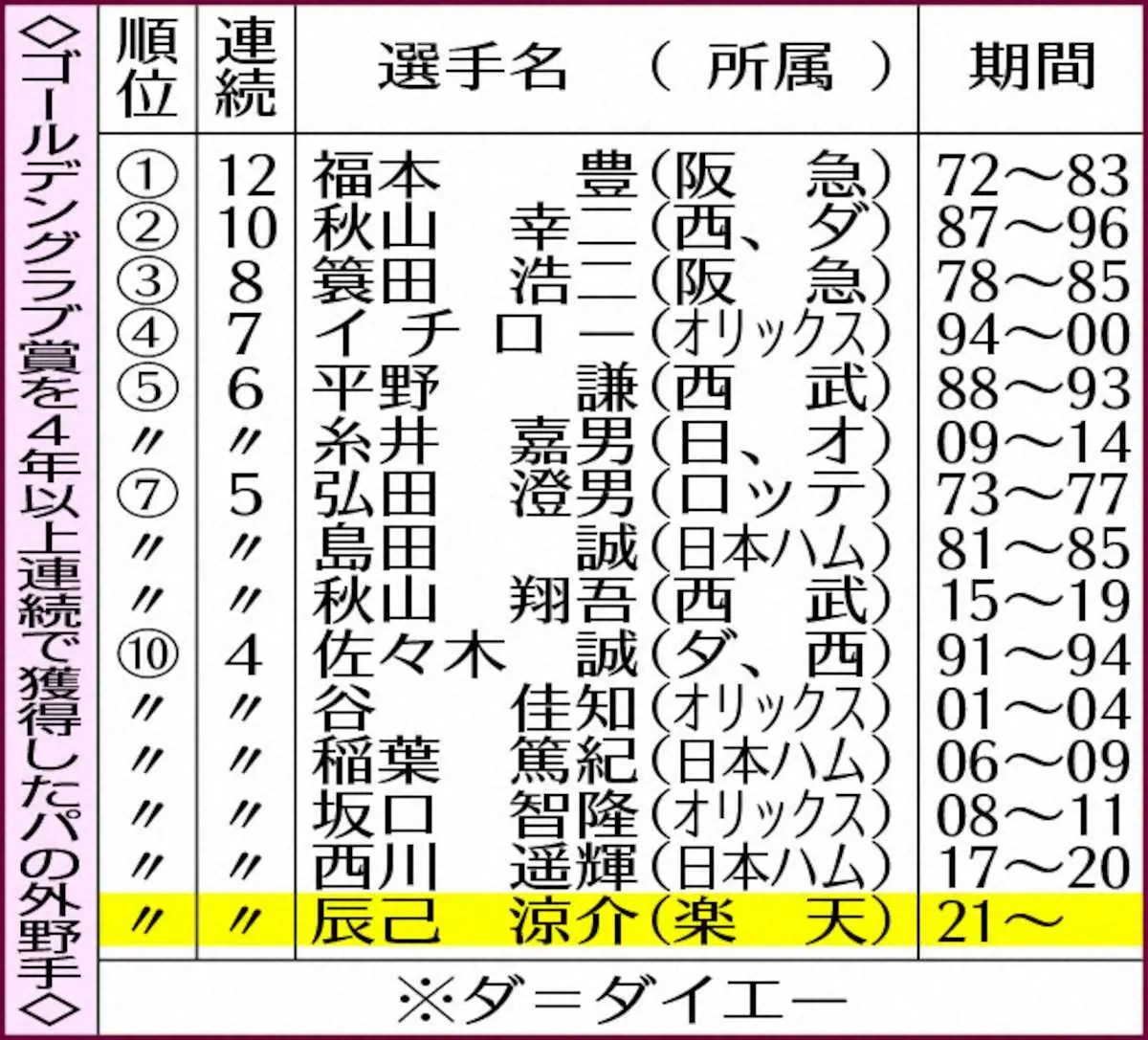 4年連続でゴールデングラブ賞を受賞した辰己 Photo by スポニチ 【記録レビュー】楽天・辰己 76年ぶり最多更新!外野手397刺殺 ギャラリーで見る この記事のフォト 2024年12月17日の画像一覧 もっと見る 2024年12月17日の画像をもっと見る