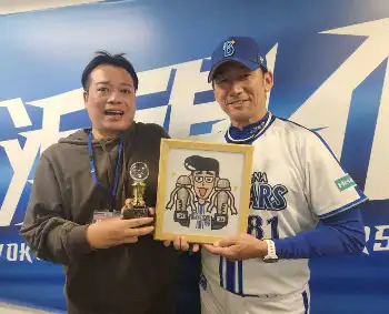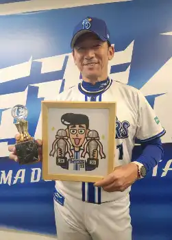 ≪記念イラスト贈呈 みずしなさんは昔の自分に感謝≫記念のイラストを贈呈したみずしなさんは、三浦監督が昔の色紙を実家に飾っていると聞き「スーパーレジェンドの方が自分のことを覚えてくださっていて…。昔の自分に“ありがとう”と言いたい!」。今季も球場に何度も足を運び、SNSにも選手のイラストなどを投稿。「“日本一になるぞ!”という思いをみんなで共有できた。それがこんなにうれしいんだと。26年前の印象が強かったけど、ようやく更新できました」と笑顔で話した。