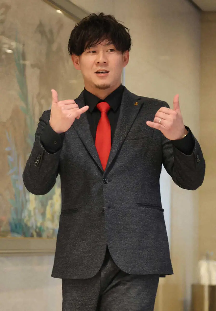 <ソフトバンク>契約を更改した牧原大はアロハポーズで会見場に登場(撮影・成瀬 徹)