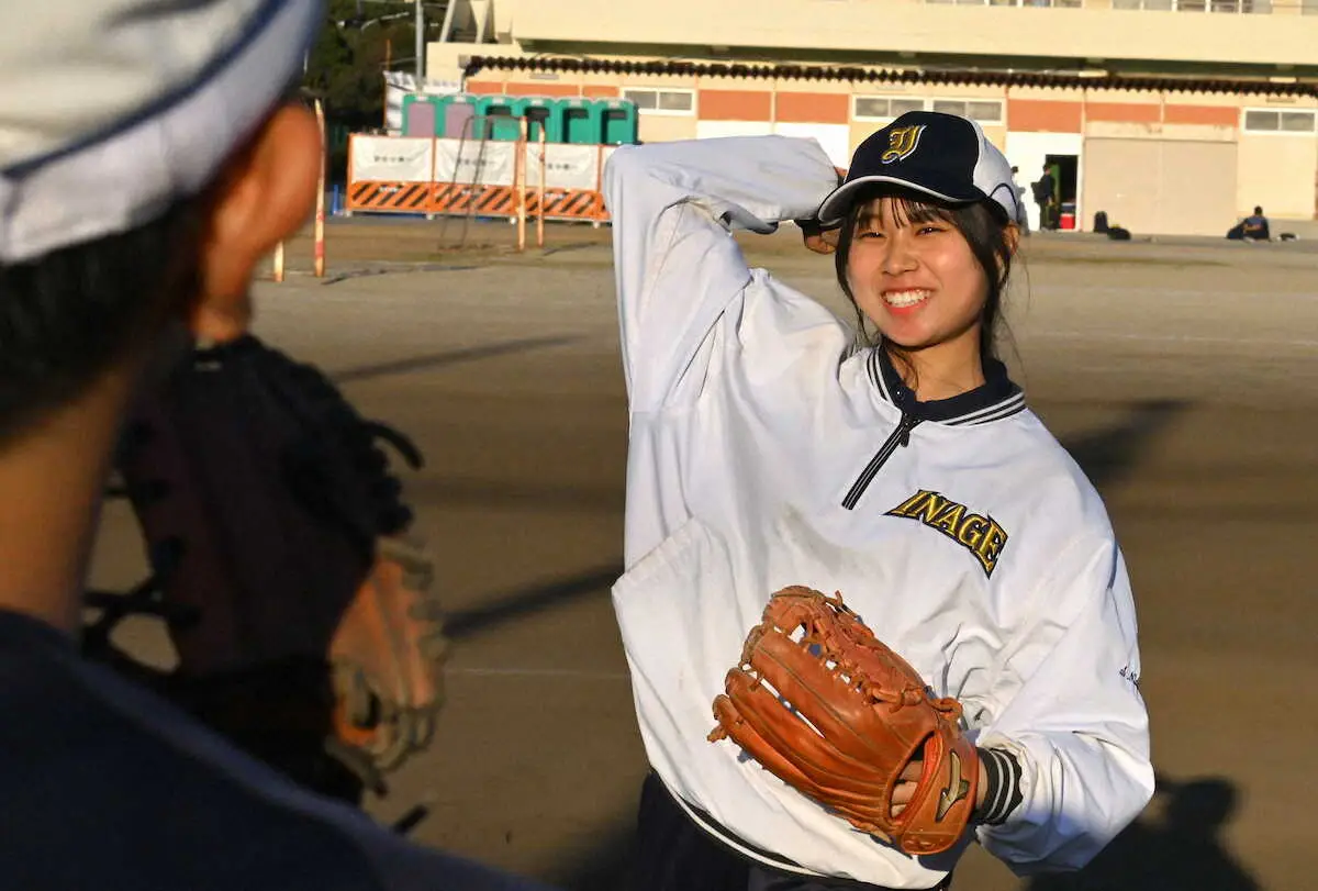選手とキャッチボールする稲毛(千葉)の西沢史桜(しおん)マネジャー(2年)