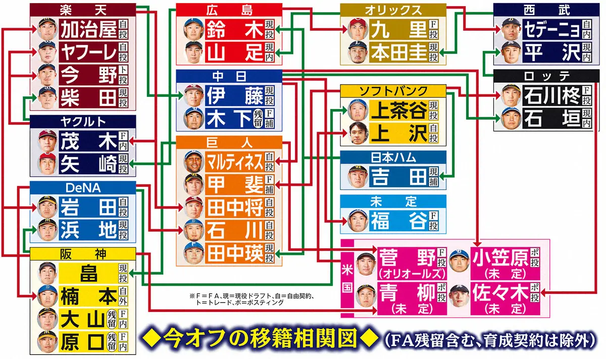 九里(広島→オリックス)、石川(ソフトバンク→ロッテ)、茂木(楽天→ヤクルト)に加えて菅野(巨人→オリオールズ)、甲斐(ソフトバンク→巨人)は移籍先が決まり、大山ら3選手は残留した。