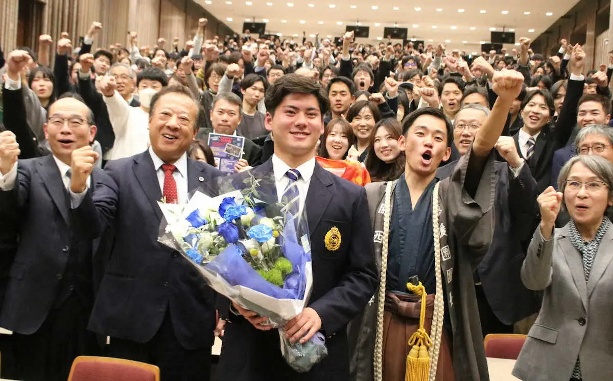 関大の壮行会に参加した中日ドラフト1位の金丸(中央)(撮影・河合 洋介)