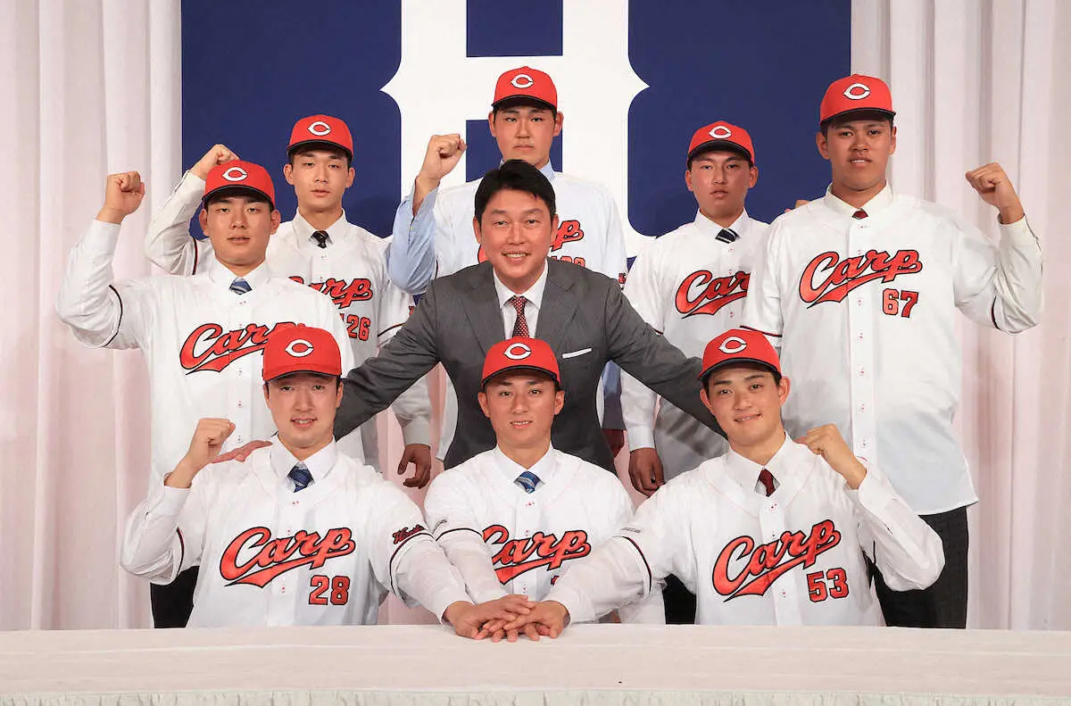 <広島新入団選手発表>(前列左から)佐藤柳、佐々木、岡本(2列目左から)渡辺、新井監督、菊地(後列左から)竹下、小船、安竹(撮影・岸 良祐)
