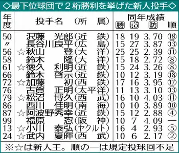 もっとも、チームは21年以来3年ぶりのテールエンド。最下位球団の新人2桁勝利は13年小川泰弘(ヤ=16勝)以来14人目。チームでは72年加藤初、76年古賀正明、79年松沼博久に次ぎ4人目だが、防御率3点未満は武内しかいない。実際、最下位球団の投手が防御率2位以内はプロ野球でも今季の高橋宏(中=防御率1位)を含め15人、16度目と少ない。過去、外国人投手を除き入団年数で最速は19年山本由伸(オ=防御率1位)の3年目で、新人投手が2位以内は武内が初めてだ。さらに今季はチームの2連敗以上を5度止めて勝利投手に。パの先発投手で連敗阻止を5度は伊藤(日)ら4人いた4度を上回り最多。劣勢の環境下でも力を発揮した。(記録課・宮入 徹)