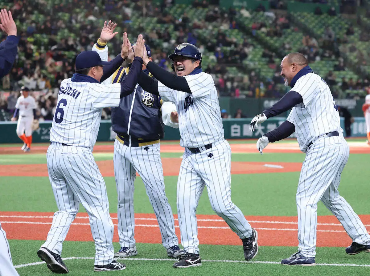 日本プロ野球名球会が22日、ベルーナドームで不動産、建設業の「立飛グループ」創立100周年記念事業として開催された立川オールスターズとのエキシビションマッチに臨んだ。軟式球、7回制の特別試合。2―2の同点で迎えた7回に、名球会が劇的なサヨナラ勝利を飾った。