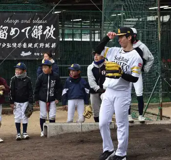 この日は学校で行われた野球教室にソフトバンクのユニホーム姿で参加。野球少年少女約120人とキャッチボールや鬼ごっこなどで触れ合った。最速153キロの直球とスライダーやフォークなどを操る右腕はブルペンで投球も披露。多彩な変化球で視線を独り占めにし、約1時間のサイン会も行った。