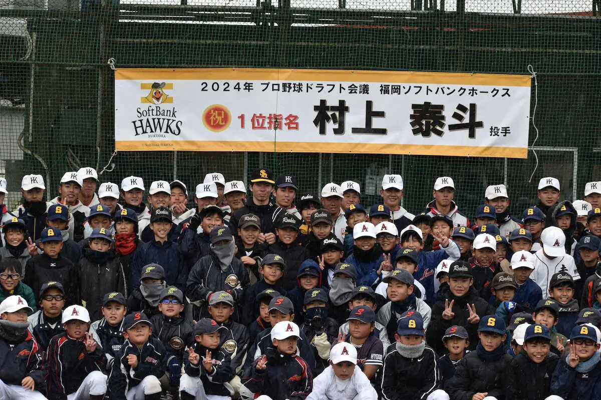 野球教室参加者と集合写真に納まるソフトバンクのドラフト1位・村上(最後列中央付近)