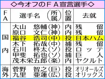 日本ハムは24日、中日から国内FA権を行使した福谷浩司投手(33)と入団合意に達したと正式発表した。福谷は自身のSNSで「いつか地域やチームの垣根を越えて野球界に貢献したいという思いの下、野球選手としての経験を増やし、高みを目指すことを目標に移籍を決断しました」と記した。