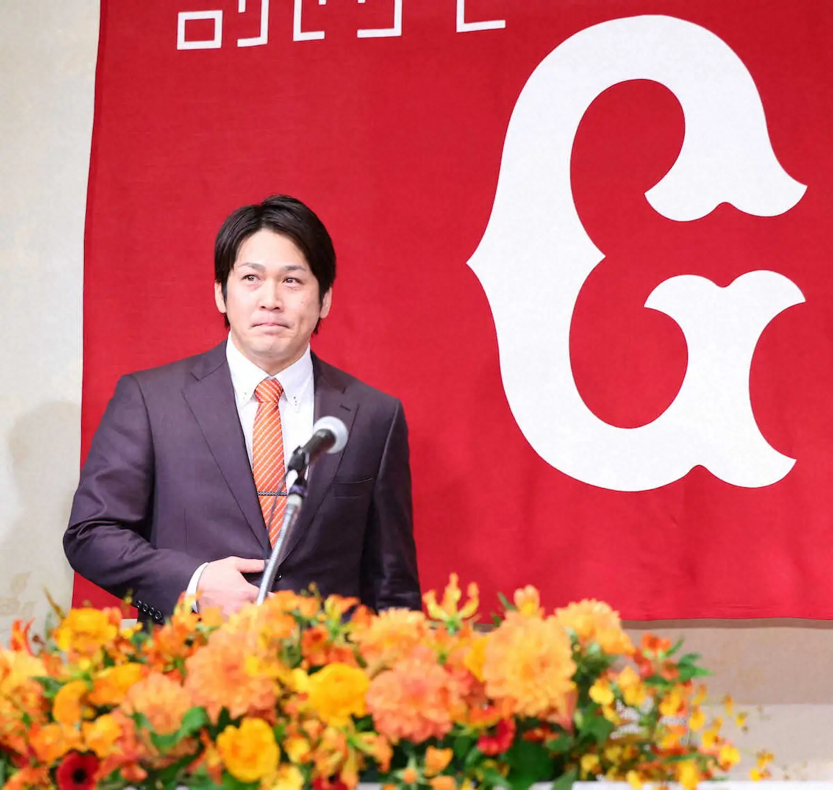 オレンジ色のネクタイ姿で登壇した甲斐は「今回、移籍に際し、とても熱いお言葉を阿部監督からいただき、胴上げするために気持ちを新たに頑張っていく。本当に光栄なことだと思う。気持ちをあらたにもう一度、スタートするという気持ちでいます。(ネクタイは)この日に合わせてきました。これは後輩からプレゼントしてもらった」と話した。