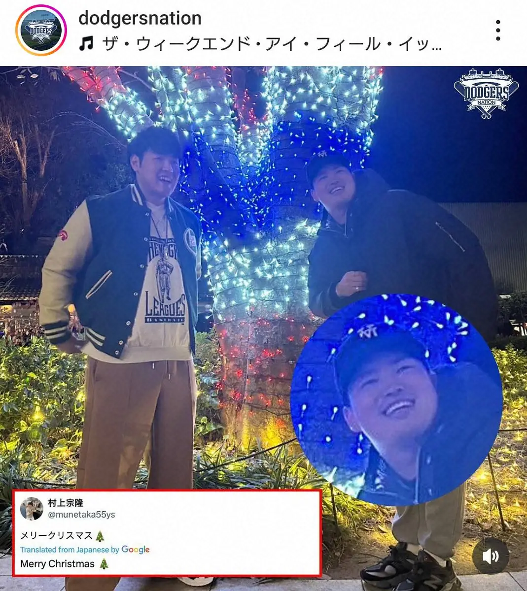 村上が25日に「メリークリスマス」とのメッセージを添えて岡本とのツーショットを投稿。「ドジャースネーション」はこの写真で村上がかぶっていた帽子に注目し、拡大画像とともに投稿した。