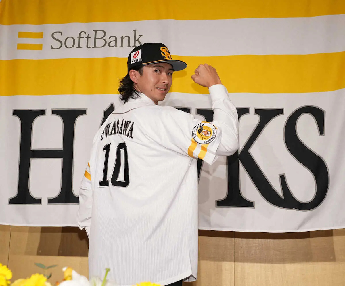 ユニホームに袖を通し、ポーズを決めるソフトバンク・上沢(撮影・岡田 丈靖)