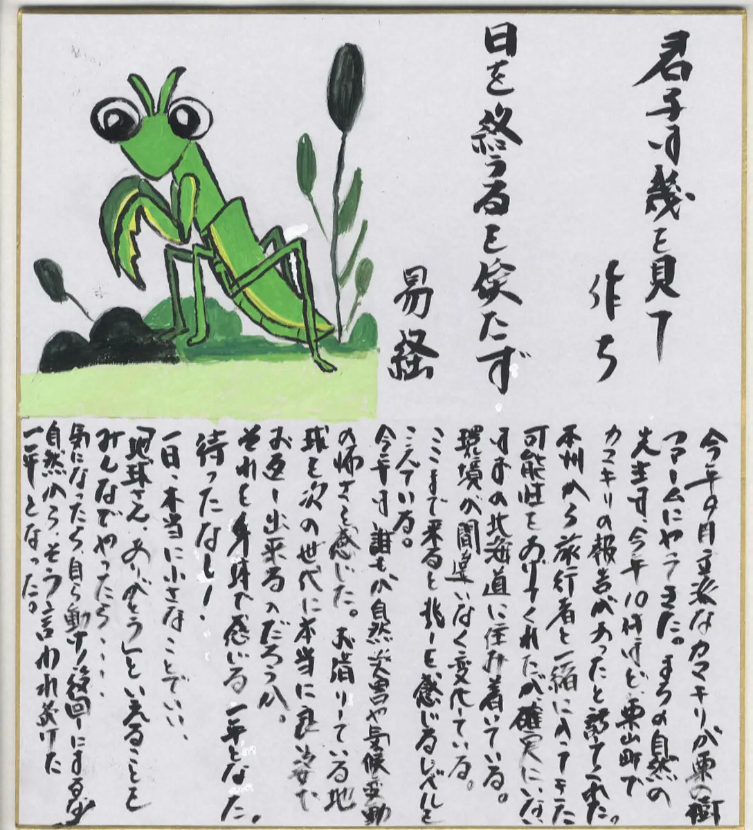これは、古代中国の書「易経」にある言葉だ。その兆しがどんな結果をもたらせるかを知る者は、それを見たら直ちに動き、一日も待たない。そういうことを言っている。「時の書」ともいわれる「易経」は、全ては自然から学び、自然が人の生きざまを教えてくれるとしている。今秋にカマキリに抱いた「違和感」は、それこそ自然が教えてくれた兆しなのだと思った。