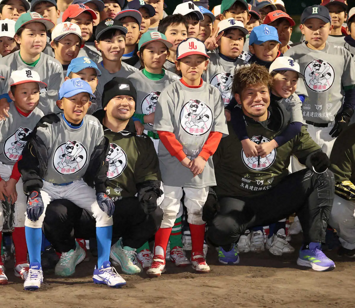 記念写真に納まるオリックス・森(最前列左寄り)と頓宮(同右寄り)(撮影・平嶋 理子)