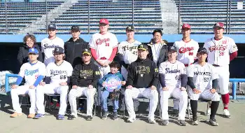 <プロ野球静岡県人会野球教室>野球教室に参加し、父・勇気さん(後列右から3人目)、母・梓さん(後列左端)、弟の陽さん(前列中央)らと記念写真に納まる佐野(後列左から5人目)(撮影・長嶋 久樹)