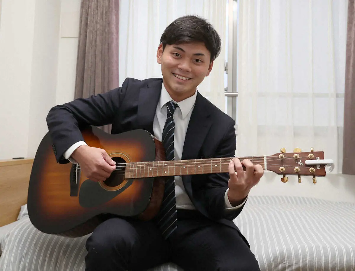 国士舘高時代に1万8000円で購入したアコースティックギターを持参し、いきなり報道陣の前で腕前を初披露。シンガー・ソングライター・瑛人の楽曲「香水」のイントロを奏でてみせた。