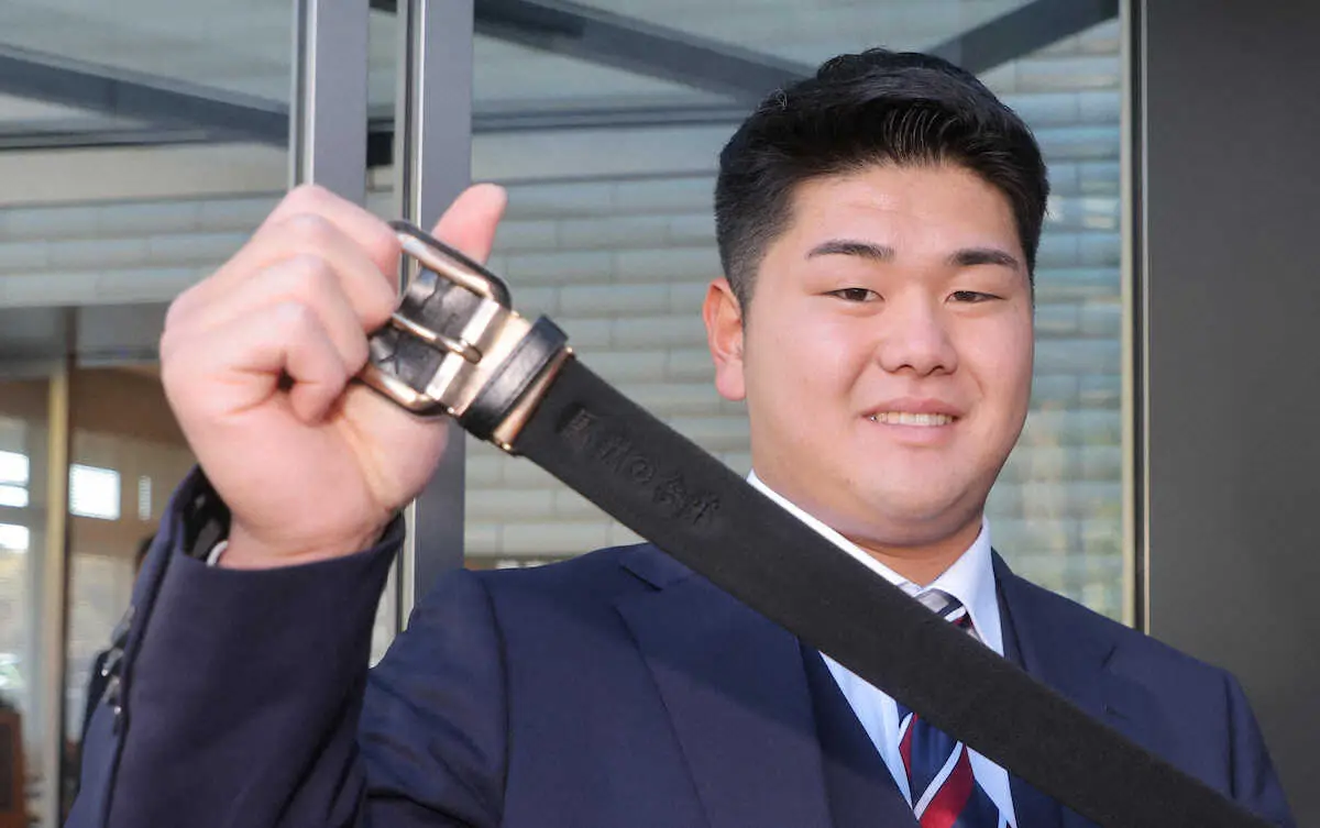 明徳義塾の恩師・馬淵史郎監督を慕い、高校2年の時に購入。試合で使用していたもので「お守り代わり。“おるな”って思えるように。大事なベルトです」と笑った。