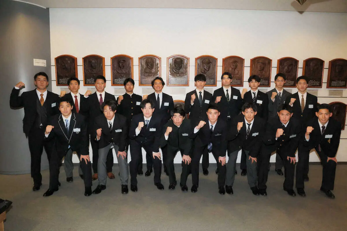 <NPB新人研修会>ソフトバンク・王貞治球団会長のレリーフの前で写真に納まるソフトバンクの(前列左から)津嘉山、岩崎、安徳、村上、庄子、石見、宇野、大下(後列左から)岡田、広瀬・漁府、曽布川、大友、川口、相原、熊谷、河野、塩士