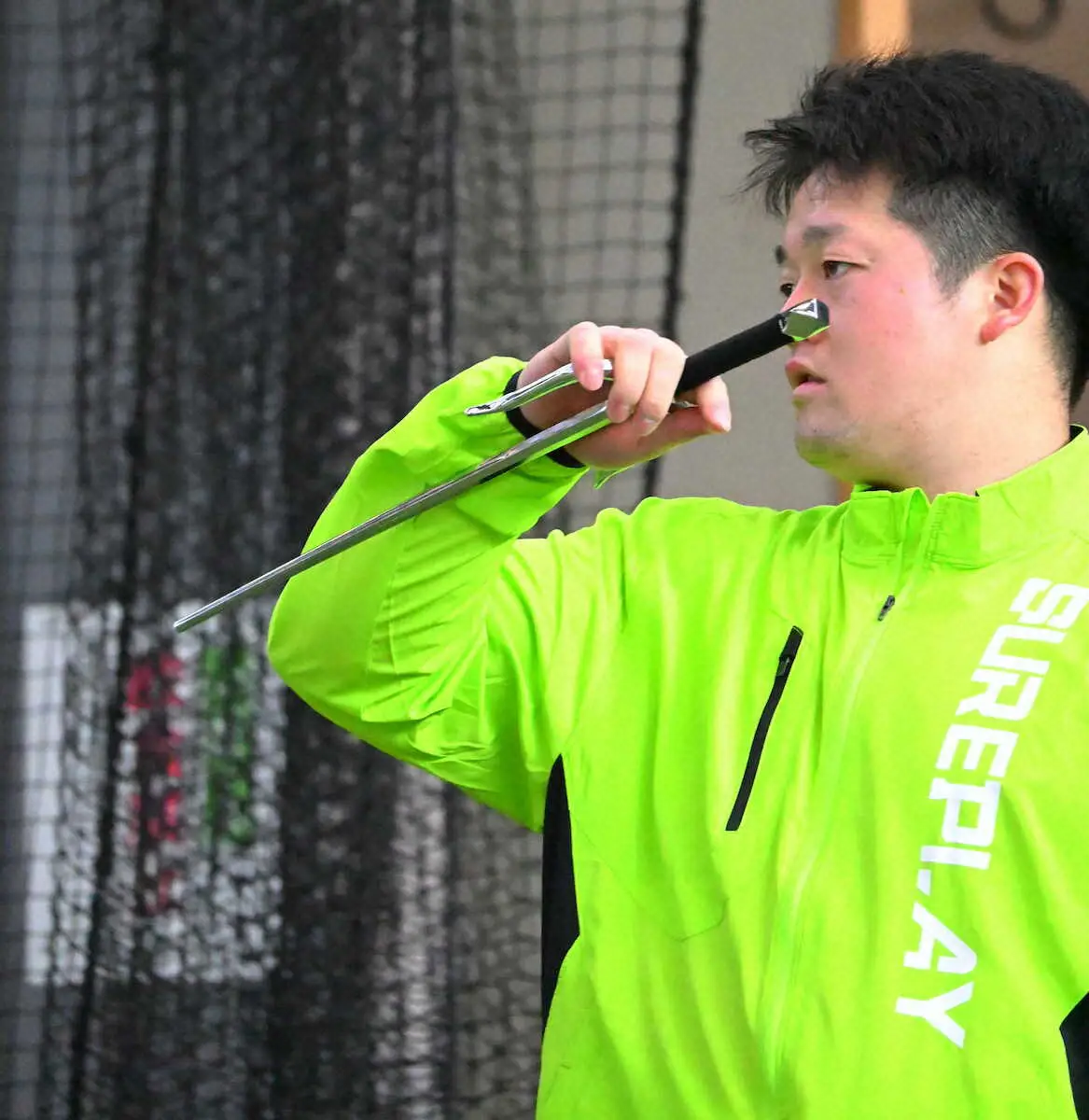 価格1万2000円、680グラムの武具。肘や手首の柔らかさがないと扱えず、上半身と下半身が連動しないと小手先だけの動きになる。大事なのは「力の入れ方」。力みのない動作がバットコントロールにつながり、打席内での重心移動にも通じる。「一つの引き出しになる。シーズン中は試合が続くので今のうちに野球以外のことを身に付けたい。いざとなった時に思い出せれば」と説明した。