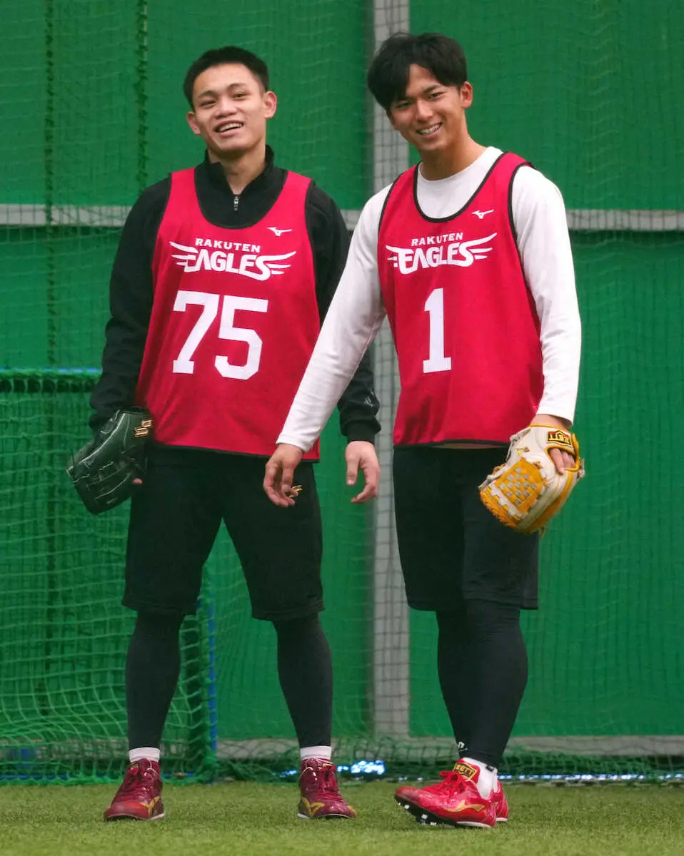 <楽天新人合同自主トレ>ノックの際、宗山(右)の動きを観察する陽柏翔(撮影・木村 揚輔) Photo by スポニチ 楽天ドラ6陽柏翔、ハタチの誓い「宗山さんに守備で負けないよう」夜間練習… ギャラリーで見る この記事のフォト 2025年01月13日の画像一覧 もっと見る 2025年01月13日の画像をもっと見る
