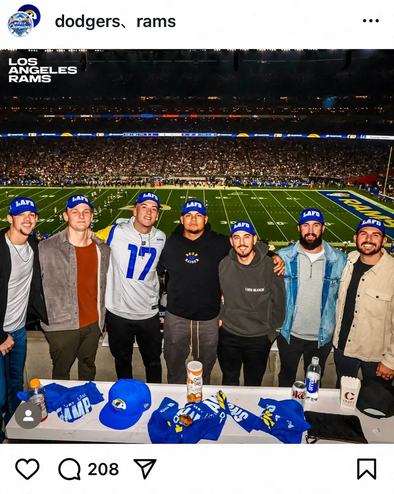 ドジャースの球団公式インスタグラムが13日(日本時間14日)に更新され、ボビー・ミラー投手(25)やアレックス・ベシア投手(28)、オースティン・バーンズ捕手(35)ら複数の選手が同じロサンゼルスを本拠とするNFLラムズのプレーオフを観戦した写真が公開された。