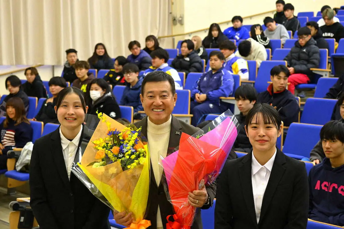特別講義後に学生から花束を贈られる巨人前監督の原辰徳氏