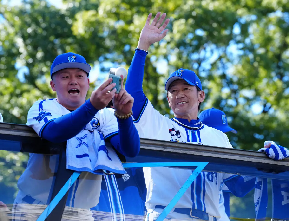 DeNA日本一パレードで声援に応える三浦監督(右)と牧