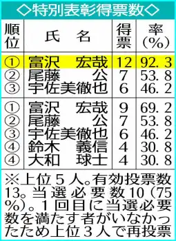 特別表彰では元セ・リーグ審判部長の富沢氏が殿堂入りした。選手経験のない審判員の草分け的存在で、在籍35年で審判員として歴代2位の通算3775試合に出場。存命者では史上最高齢93歳での選出に「こんな幸せな日を迎えられるとは夢のようです。長生きして本当に良かった」と左手を突き上げた。