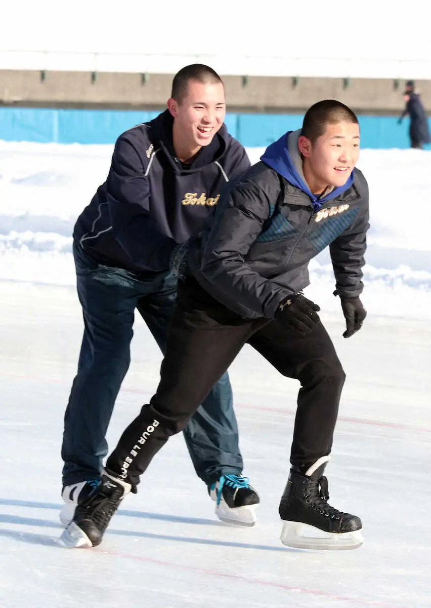 遠藤愛義監督(40)はスケートが内転筋や体幹強化につながると、北海道の環境も生かしたトレーニングの狙いを明かす。昨オフも室内リンクで1度行ったが、屋外では初めて。冬季間は室内練習が続くだけに、久しぶりに快晴の屋外で体を動かした。慣れない氷上に転倒続出も笑顔が絶えず、苫小牧市出身の宮崎泰地内野手(2年)は「(苫小牧市は)アイスホッケーが盛んな地域で小さい時から小学校の授業でやっていたので得意。スケートは下半身の体幹の強さが磨かれる」と仲間をサポートしながら1周400メートルのリンクで周回を重ねた。