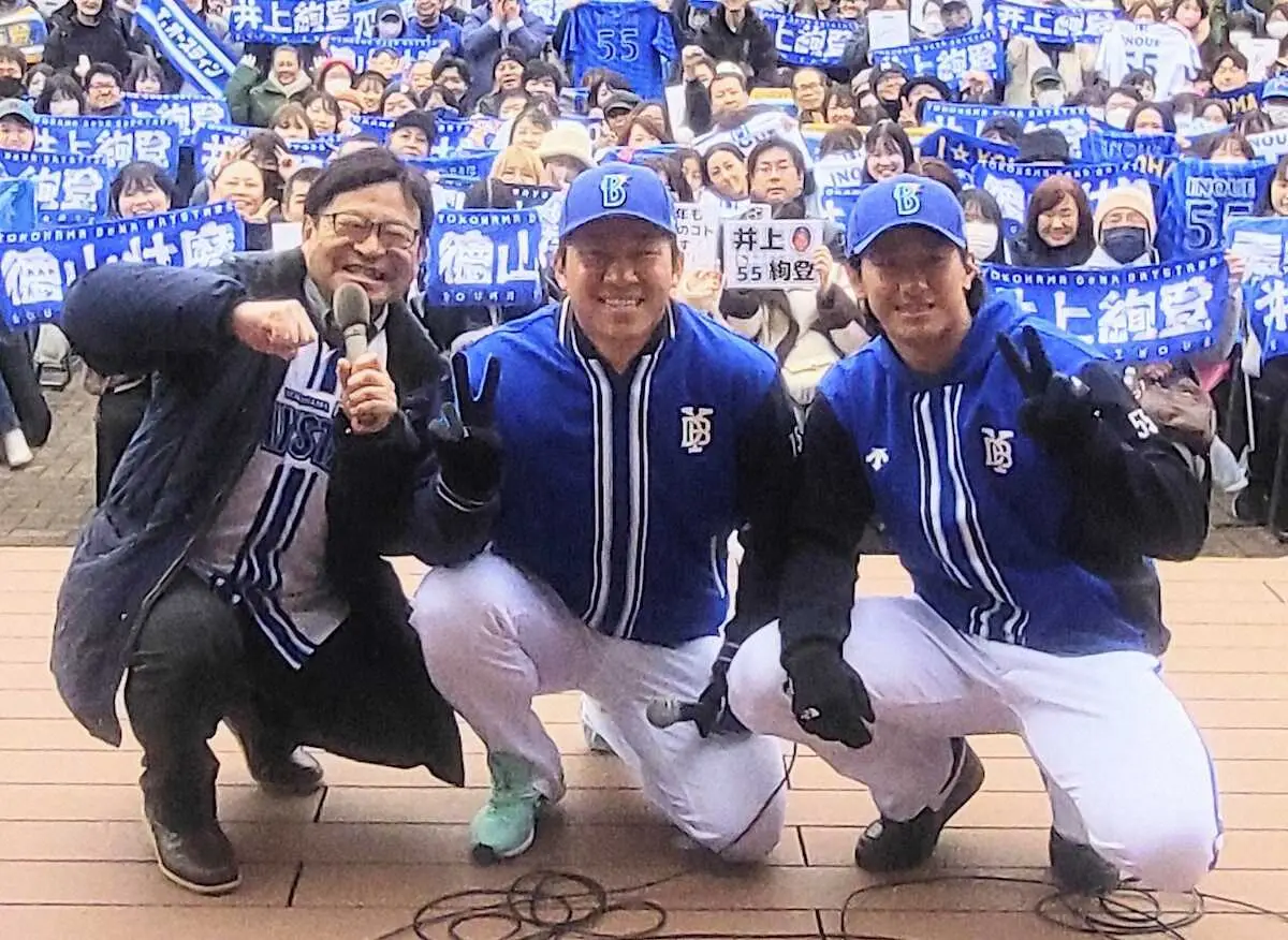 DeNAの同学年、4年目の徳山壮磨投手(25)と2年目の井上絢登外野手(24)が19日、横浜市西区内の「tvkハウジングプラザ横浜」でトークショーを開催。気温7度の屋外で、集まった約500人のファンに向け大盛り上がりの「トーク」を展開した。