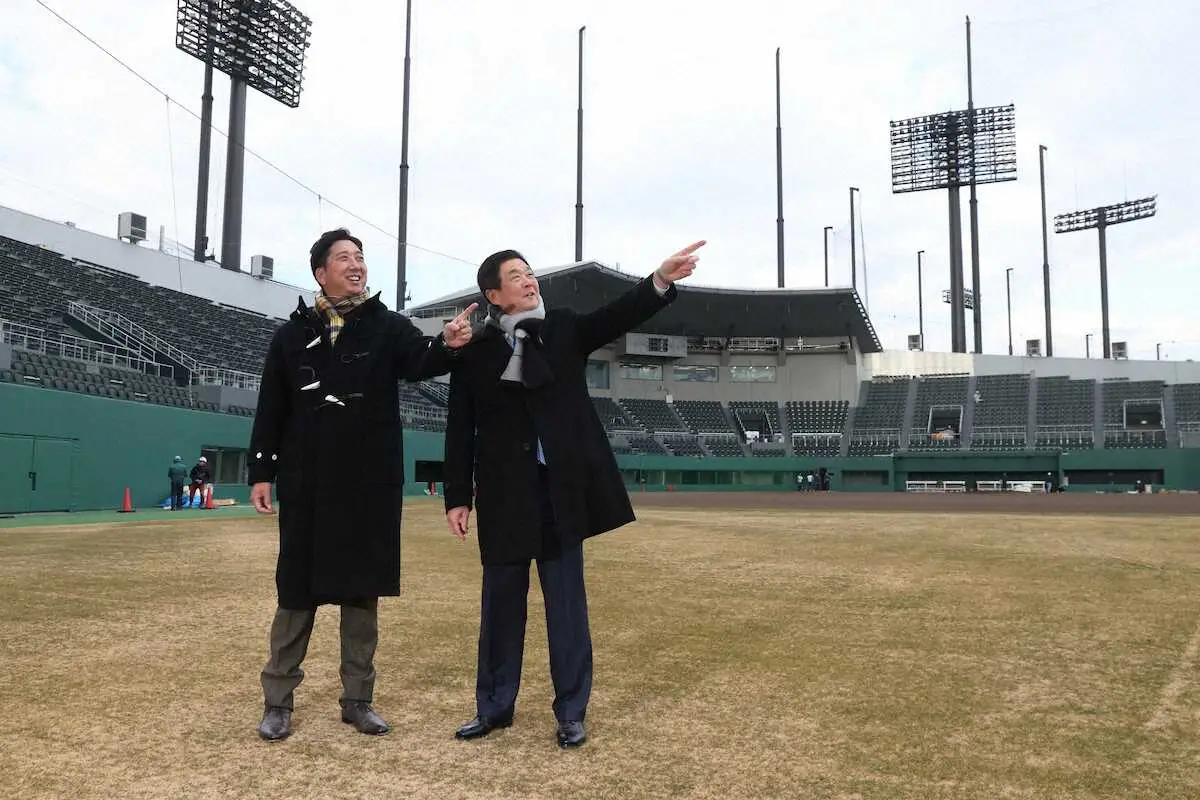 ゼロカーボンベースボールパークを視察する藤川監督(左)と平田2軍監督(撮影・大森  寛明)