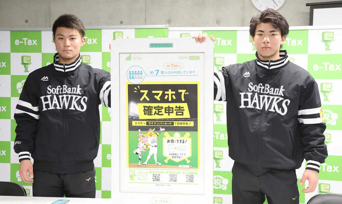 ソフトバンクのドラフト1位の村上泰斗投手(神戸弘陵)と同2位の庄子雄大内野手(神奈川大)が21日、タマスタ筑後でスマホを使った確定申告のPRイベントに出席した。