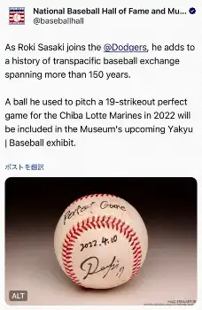 同博物館のXは「佐々木朗希選手がドジャースにに入団したことで、150年以上にわたる太平洋を越えた野球交流の歴史がさらに深まる」と紹介。