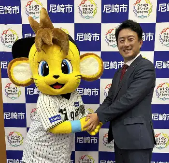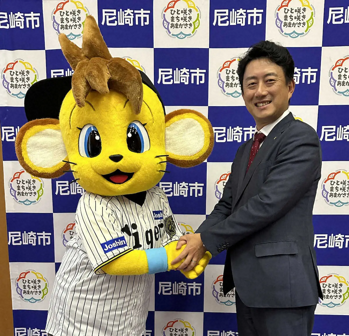 阪神マスコット「コラッキー」が尼崎市役所を電撃訪問 松本市長「新球場開業に向けて元気をもらった」