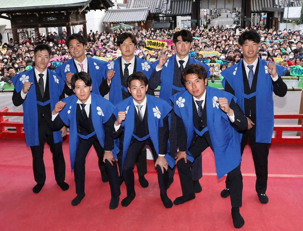 今季2年目となる阪神23年ドラフト組の8選手が25日、大阪天満宮で行われた「初天神梅花祭」に参加した。約1000人集まったファンの前に、青の陣羽織を羽織って登場。イベント後に津田は今オフ、パドレス・松井に弟子入りしていたことを明かした。