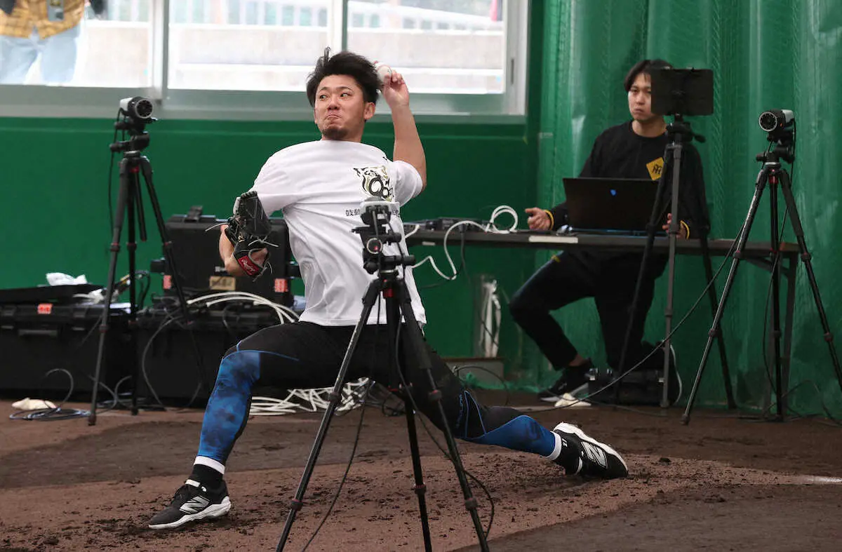 モーションキャプチャーを用いてフォームを解析する阪神・伊藤将(撮影・大森 寛明)