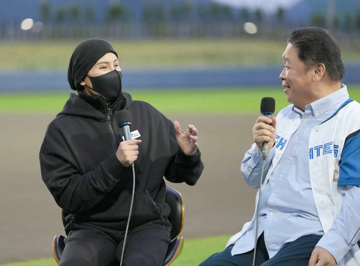 <日本ハム>花火前に伊集院(右)らとトークを行う新庄監督(撮影・高橋 茂夫)