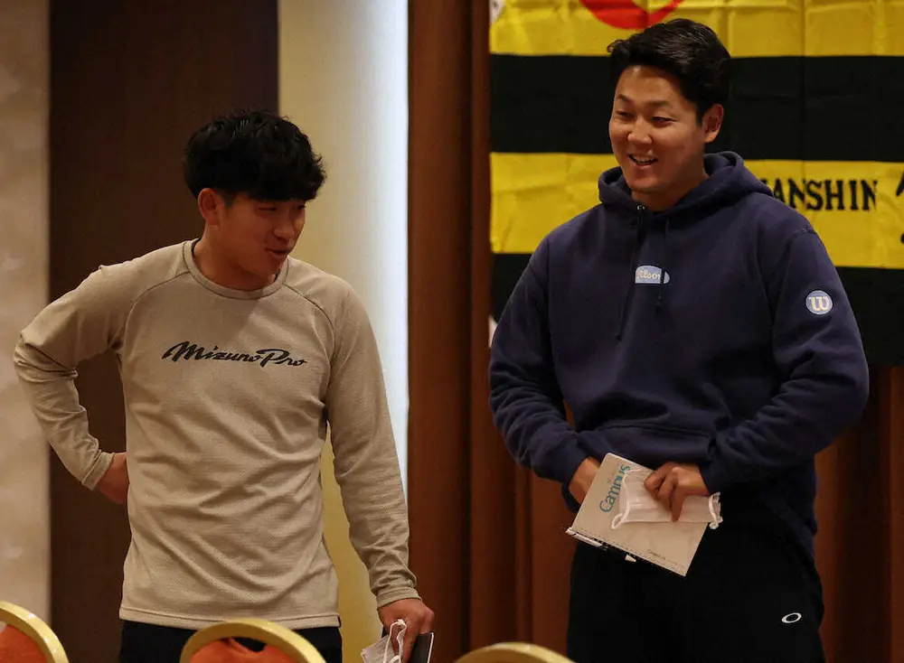 ミーティング会場に入り、談笑する阪神の伊原(左)と木下