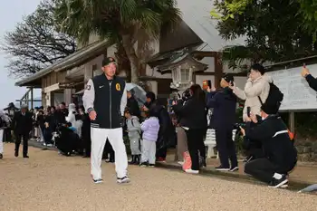 <巨人春季キャンプ第1クール初日>ファンの前を通って、青島神社を参拝する阿部監督(撮影・光山 貴大)