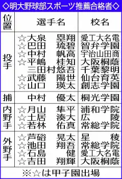 明大野球部 新人15人発表 大阪桐蔭・平嶋「明治で一番いい投手に」