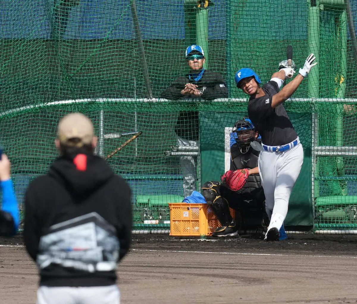 低い弾道でも、ぐんぐん伸びる。フリー打撃の中盤だ。万波が放った打球が、名護の爽やかな風にも乗って、バックスクリーン右のフェンスを越えた。これこそ、自主トレ期間から取り組んできた打撃改造の成果を表す一本だ。