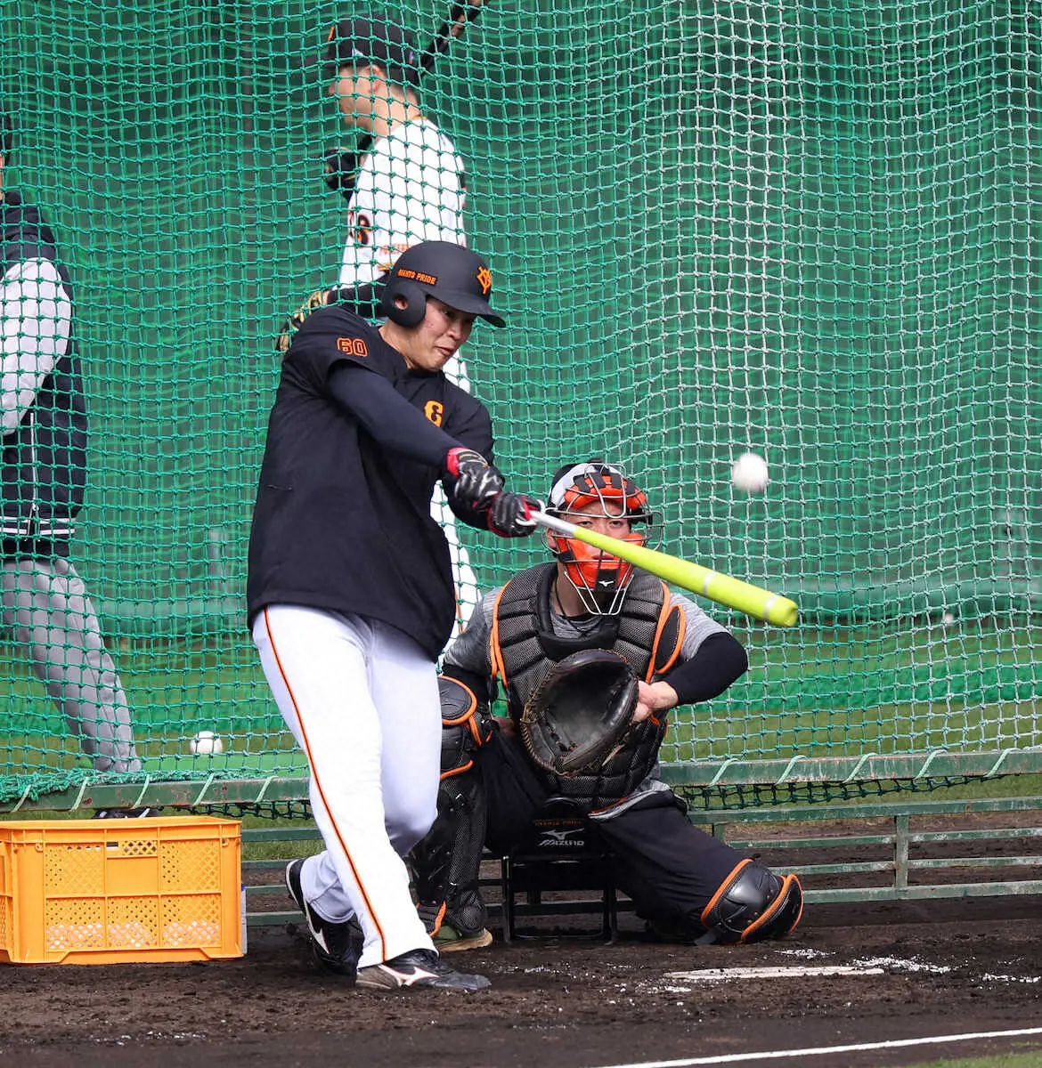 巨人期待のルーキーが、打撃練習で鋭いスイングを見せた。