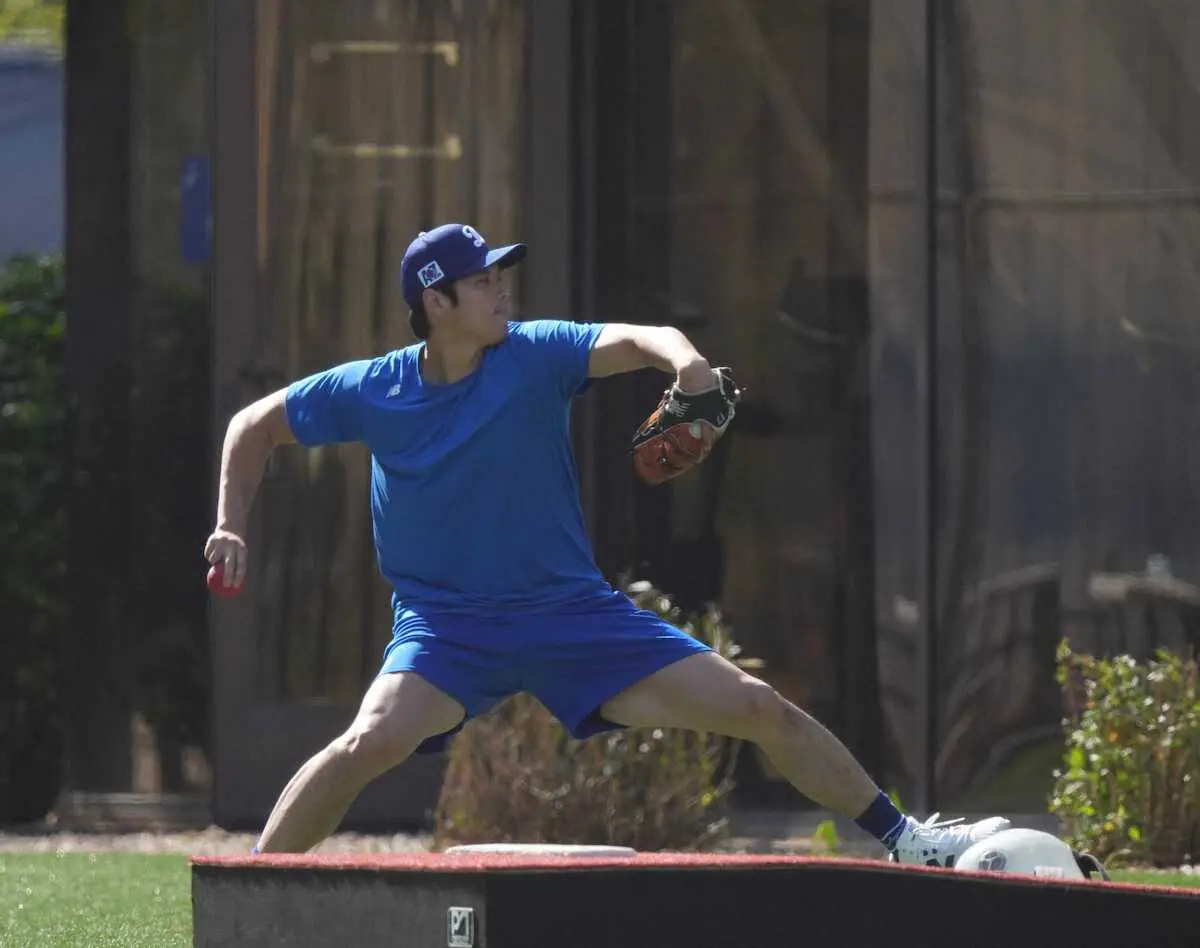 黒のTシャツ姿で登場した大谷は、グラブを持って屋外に登場。関係者が見守る中、壁当てや約15分ほどのキャッチボールでスプリットを投じるなど投球練習を行った。途中、小犬が迷い込んで中断するハプニングもあったが、滞りなく練習は行った。
