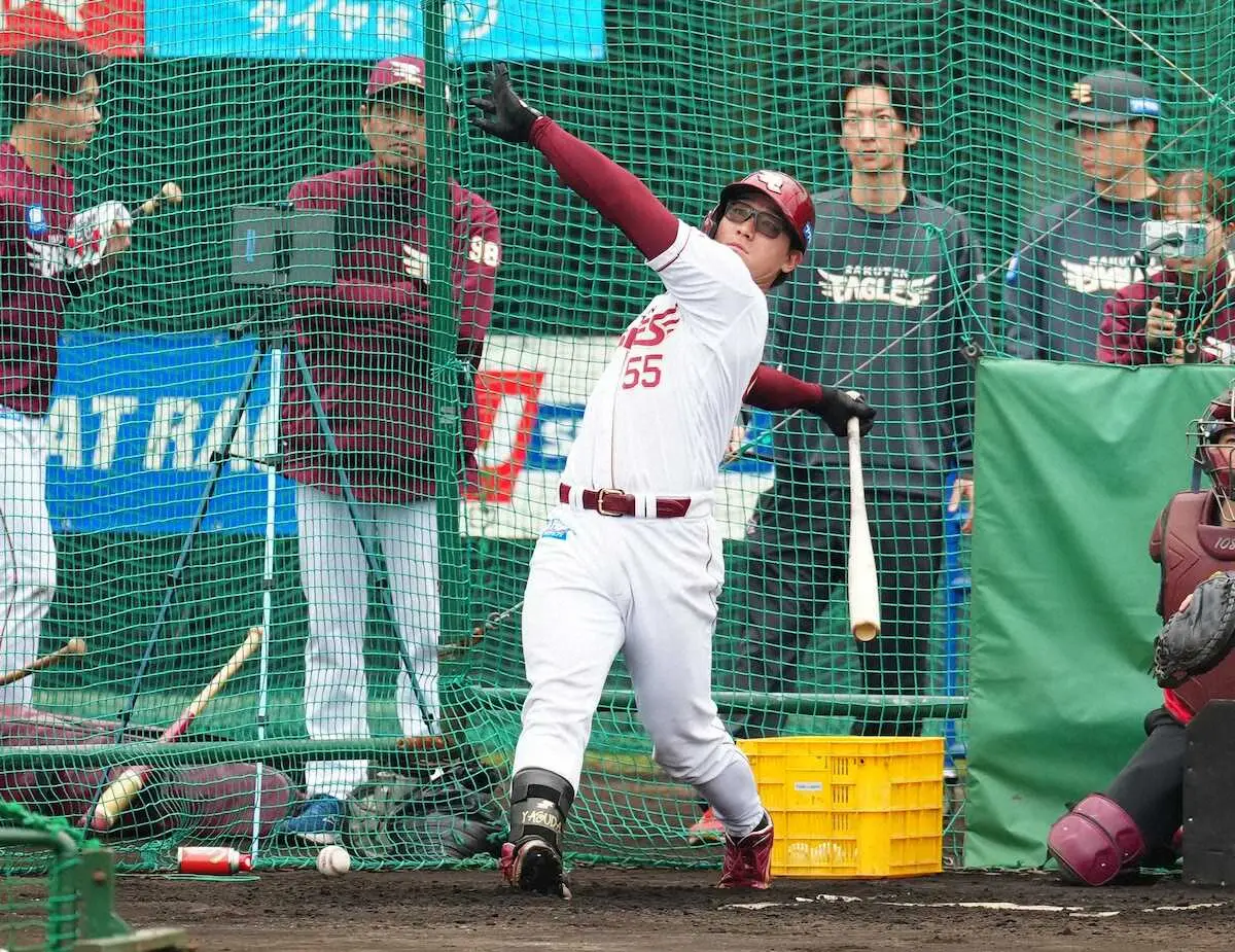 楽天強打の捕手・安田がフリー打撃で推定140メートル弾を放ち、スコアボードを破壊した。