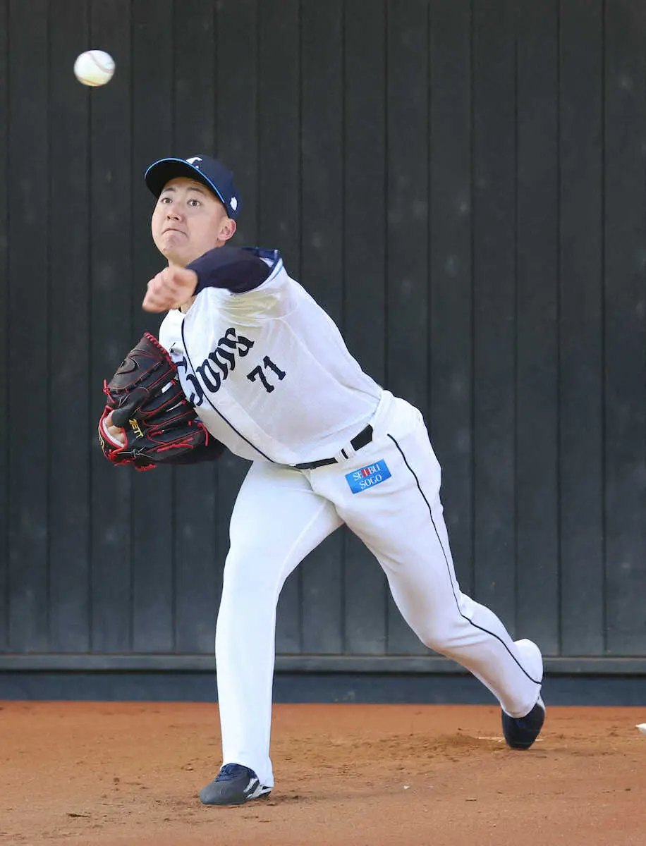 ▼西武・菅井(松坂氏の前で投球練習)あれ(内角攻め)があったらもっと幅が広がるかなと練習している。