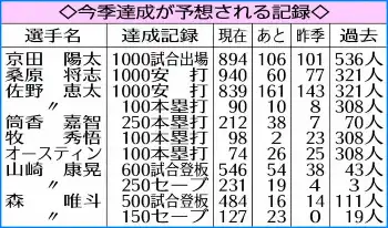 DeNAの牧は通算100本塁打にあと2本。入団1年目からは22→24→29→23と4年連続20本塁打以上を継続中。今季もクリアすれば清原和博(西、巨=13年)、原辰徳(巨=12年)、有藤道世(ロ=8年)に次ぎ石井浩郎(近鉄=5年)と並び史上5人目になる。