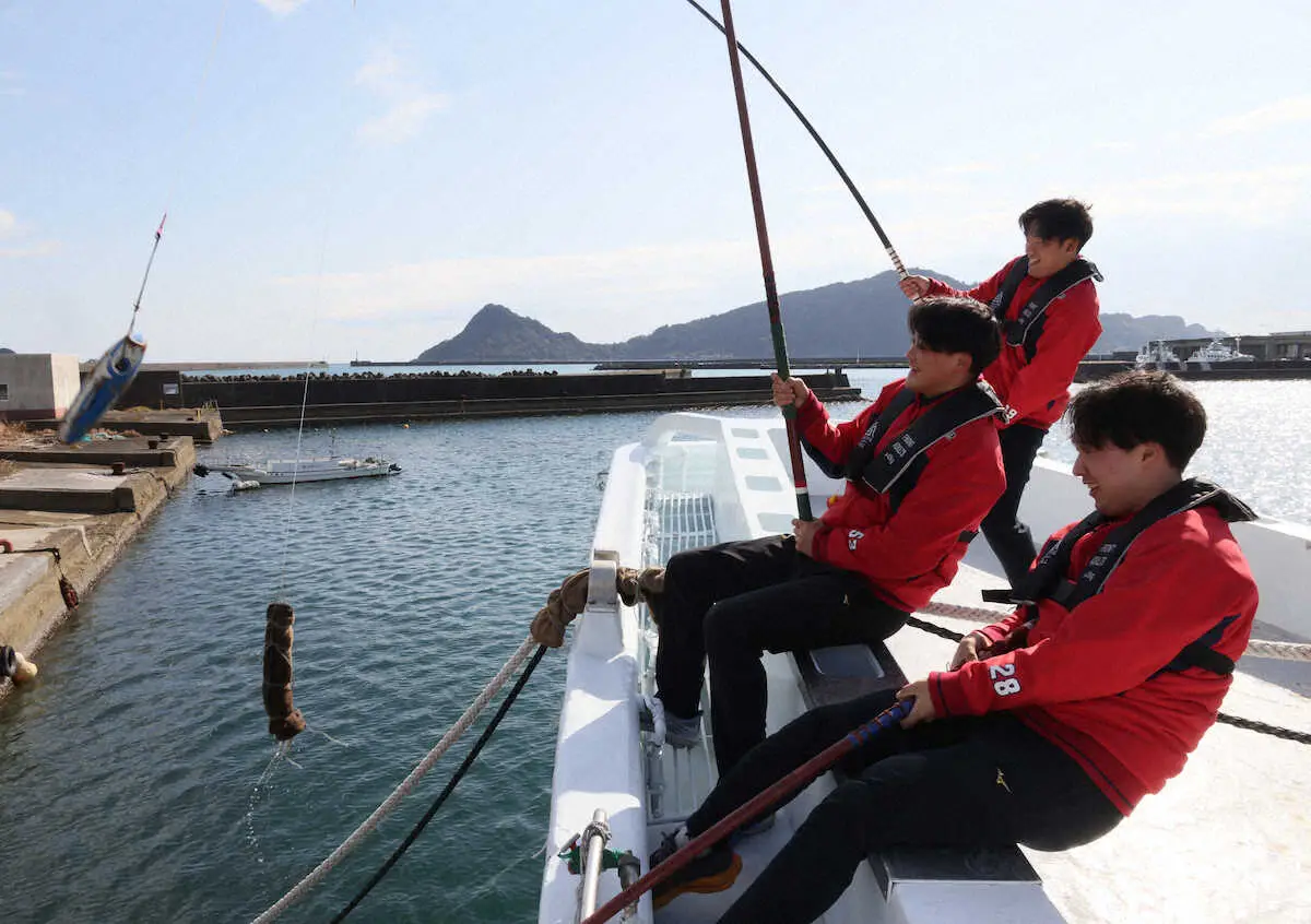 広島の1軍に同行する新人3選手が7日、キャンプ初の休日にカツオの一本釣りを体験した。