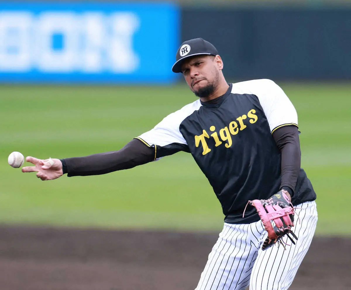 初陣に向けて、この日も最高気温14度止まりの寒さにも負けず、志願の早出で打撃マシンを相手に特打を敢行した。屋外フリー打撃でも56スイングで柵越え7本。中堅方向を中心に振り回すだけではないミート力を藤川監督にもアピールした。投内連係では三塁のポジションで身長1メートル93の巨体を揺らしながら機敏な動きも披露した。