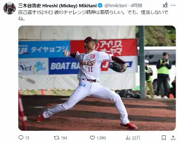 三木谷オーナーは、ブルペン投球する辰己の写真を投稿。「辰己選手152キロ 彼のチャレンジ精神は素晴らしい。でも、怪我しないでね」と姿勢を称えつつ、体を気遣った。
